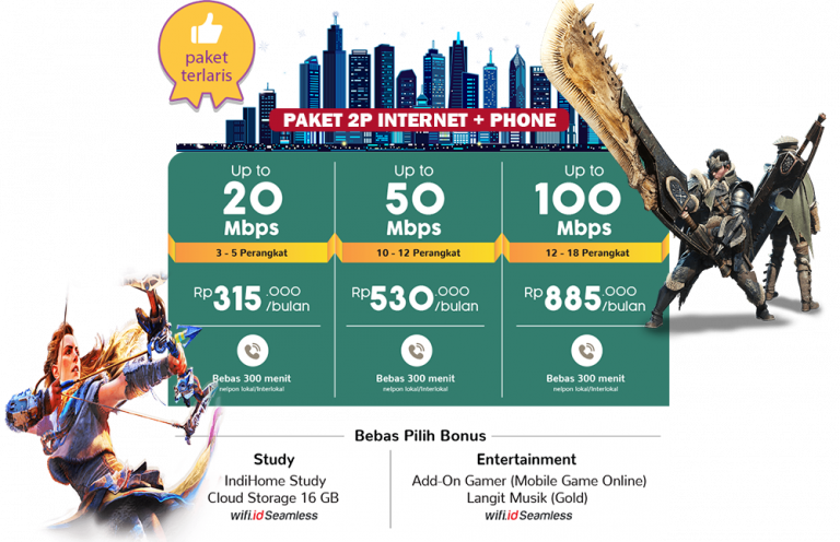 PAKET F GAMER (InternetWiFi+UseeTV New Basic 109 Channel+Line tlp 300 Menit) ——> IndiHome Gamer 20 Mbps Rp. 429.000/bln. ——> IndiHome Gamer 50 Mbps Rp. 665.500/bln. ——> IndiHome Gamer 100 Mbps Rp. 1.056.000/bln.